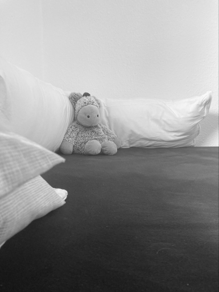 Bevor ich Mama war, war ich der festen Überzeugung, dass mein Kind in seinem Bett schlafen würde und keiner der Eheleute je dauerhaft separat schlafen würde. Ups. Unser kleines Wunder hat schon immer sehr unruhig geschlafen, obwohl das nächtliche Fläschchen schon früh kein Thema mehr war. Ein schlechter Schläfer, das war sie schon immer. Sich wälzt sich, sie jammert, sie hat Albträume, sie weint. Sie braucht den Körperkontakt und die Zuwendung, diese zu verwehren stand mir nie in den Sinn. Mama und Papa mussten nachts schon immer präsent sein. Bis sie ein halbes Jahr alt war, schlief sie meist im Beistellbett. Mir tat dann aber einfach nur noch der Rücken weh von all den Nächten, die ich von unserem Ehebett in ihr Bettchen gebeugt versuchte, Schlaf zu finden. Der zerrissene Schlaf zermürbte mich zusätzlich. Damit Papa beim Arbeiten fit war, schlief er unter der Woche extra. Dann nahm ich sie ins Ehebett hinein und sicherte die leere Seite mit Kissen und Decken. Zu dritt im Bett war nachts für uns alle nur selten erholsam und die Versuche, sie an ihr Bett und ihr Zimmer zu gewöhnen, scheiterten alle dramatisch. Je mobiler sie wurde, desto unsicherer wurde das Ehebett mittig im Raum. Papa zog wieder ein und wir zogen um – seit Mitte letzten Jahres schlafen wir getrennt nebenan. Ich kann schnell sowie bequem reagieren und sehr oft haben wir gute Nächte und ich keine Rückenschmerzen. Und ja, ich gehe immer mit ihr ins Bett und bleibe da. Einmal die Woche macht Papa eine Nacht. Sicherlich hätten wir es erzwingen können. Aber wir wählten den Weg des geringsten Widerstands und ich würde es wieder tun. Ohne Diskussion, ob das gesellschaftlich nun toll ist oder sonst was. Schlaf ist wichtig und wenn wir so alle zum bestmöglichen Schlaf kommen, ist das zu Recht unser richtiger Weg bis hier her.