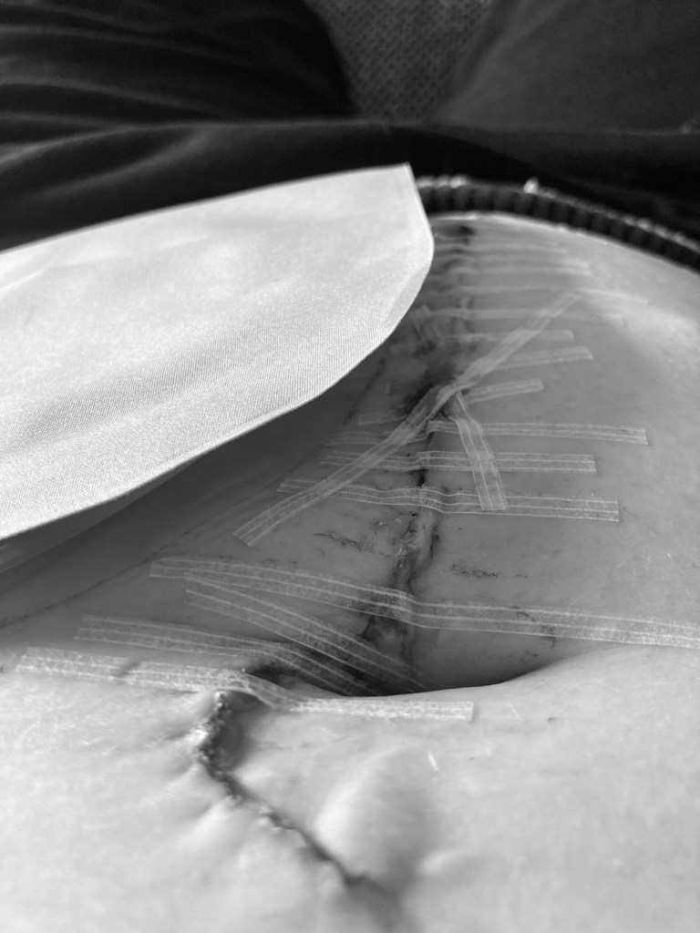 Mit dem Essen war ich in den ersten Tagen meist vorsichtig, um eine Blockade zu vermeiden. Leicht verdauliche Dinge und kleinere Portionen waren angesagt, genauso wie viel Flüssigkeit. Inzwischen versuche ich normal zu essen, gut zu kauen und genug zu trinken. Schließlich soll der Darm was zu tun bekommen, auch wenn das oft noch weh tut. Durch die große Wundfläche im Inneren tut es mir noch weh, wenn Ru arbeitet. Je mehr alles verheilt, desto besser wird auch das. Die innere Wundfläche kann ich ja nicht beeinflussen, die Bauchschnittnaht schon. Die Klammerpflaster helfen, dass die Naht auch oberflächlich geschlossen bleibt. Im Krankenhaus sagte man, wenn sie mich nerven, könnte ich diese entfernen. Aber ich kenne mich und als die ersten Stellen der Naht zu reißen begannen (weil die Pflaster versagten), bat ich meine Stoma-Schwester um Hilfe. Sie erneuerte die Klammerpflaster auf der ganzen Naht. So unterstützen wir eine schnellere Abheilung. Meine Narben. Meine Geschichte.