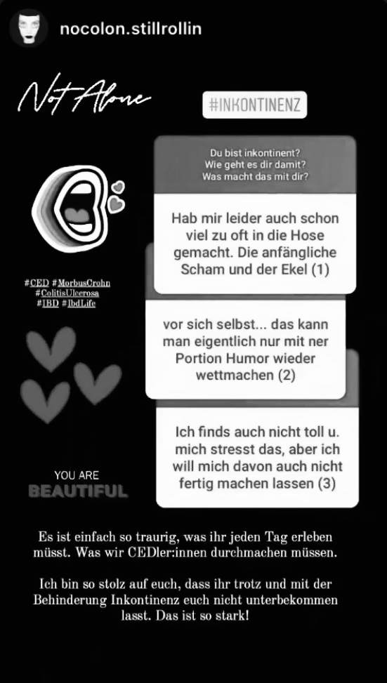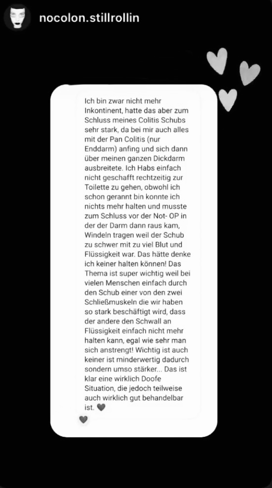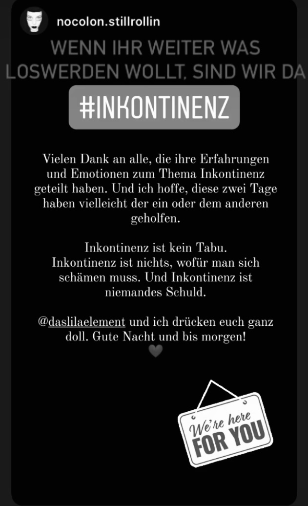 Liebe Jana, wir haben uns die Tage viel ausgetauscht. Obwohl du von Inkontinenz so nicht betroffen ist, fühlst du extrem mit. Du redest frei raus so wie ich und tust so viel für die Gemeinschaft. Danke, dass es dich gibt. Das Tabu: Inkontinenz darf nicht außen vor gelassen werden und das hast du die Tage einfach wieder klar gemacht. Es gibt schönere Themen, das wissen wir alle, aber gerade die hässlichen Themen sind die, über die geredet werden muss. Also danke für deine Plattform und deine Arbeit. Wir haben beide gemerkt, dass es für andere kein leichtes Thema war und sind beide super stolz auf jeden Einzelnen, der mit laut geworden ist, sich getraut hat und sich geöffnet haben. So funktioniert Aufklärung.