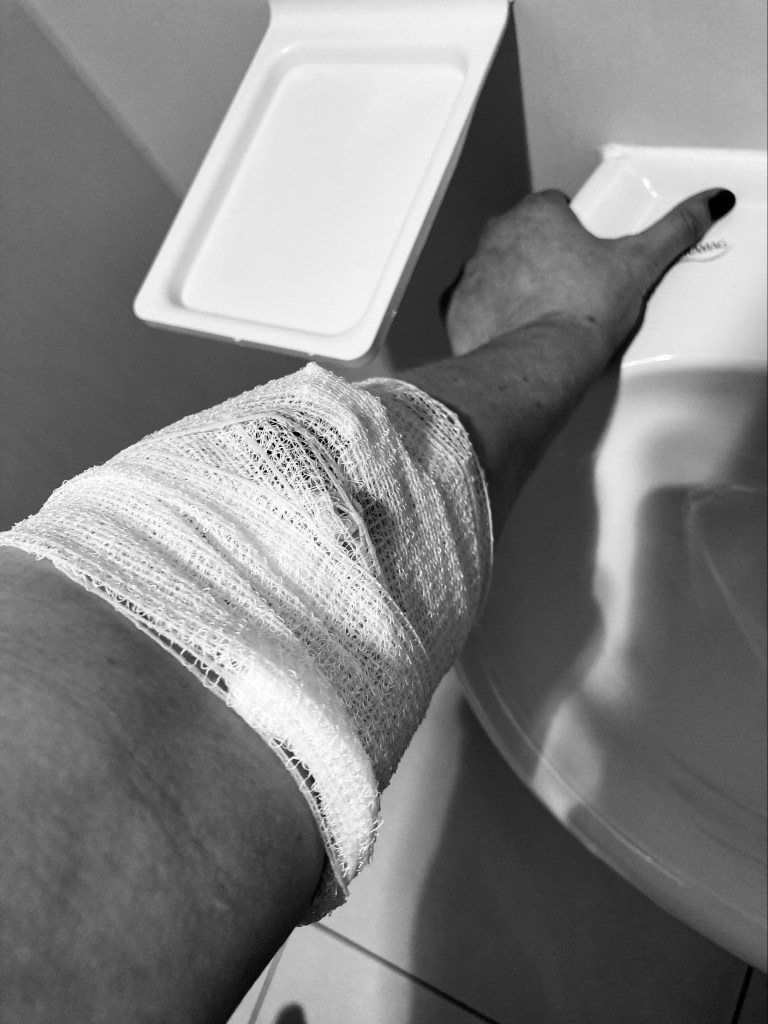 Mit dieser Wunde hält die Platte meiner Versorgung mit weiterem Material gut. Nur unterläuft sie an der Stelle der Wunde häufiger und verunreinigt die offene Stelle. Also musste ich die letzten 8 Wochen doch öfter wechseln als sonst. Eine Wunde unter der Platte war immer mein persönlicher Albtraum. Obwohl es bisher noch gut zu managen war, weiß ich nicht, was sich heute ändern wird. Denn seit geraumer Zeit war neben der Wunde ein kleines aber fast reizloses Areal aufgefallen. Seit zwei Tagen ist es nicht mehr reizlos – es schmerzt, wird rapide schlechter und eitert durch die vorhandene Wunde fröhlich vor sich hin. Wenn ich die Platte wegziehe beim Wechsel ist es wie das Ziehen eines Stöpsels. Es muss definitiv gehandelt werden und ich kann nicht abschätzen, wie sie jetzt mit der Situation umgehen werden.