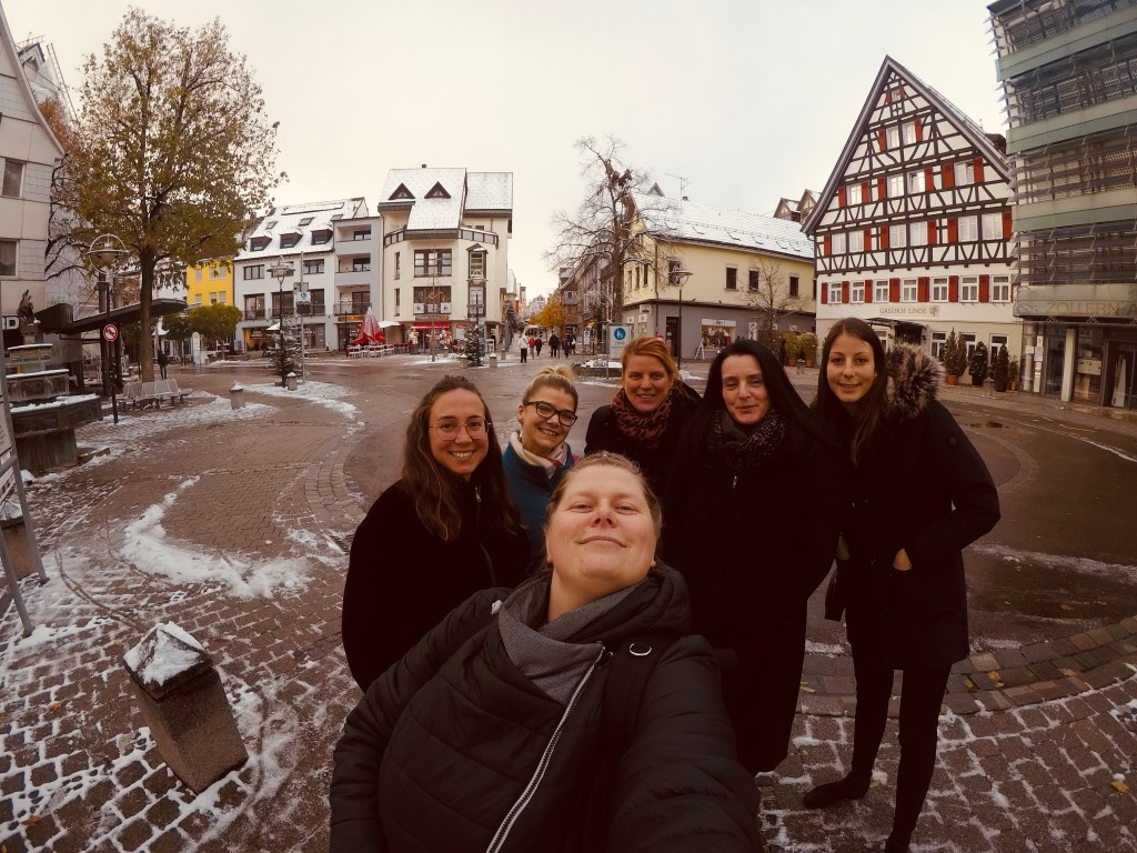 Ganz frisch in echt haben wir uns am Freitag zu Pizza, Sekt und Eierlikör getroffen. Damit ihr auf dem Land gleich richtig ankommt. Ich bekomme sogar einen Geschenkkorb aus Wien und tollste lila Blumen. Nach einer abenteuerlichen Nacht und erstem Schnee, wie bestellt, trafen wir uns zum Frühstück. Mit welcher Leichtigkeit wir zwischen den unterschiedlichsten Themen hin und her springen, ist faszinierend. Small Talk, dreckige Witze, Krankengeschichte, Stadt-Geschichte, Männer. Danach gibt es auf dem Wochenmarkt Glühwein und Sightsighting der hiesigen fragwürdigen Statuen. Das Wetter ist gnädig und wir machen einen Spaziergang zum Schlossfelsenturm. Der Ort für DIE Sicht auf Albstadt. Der Schnee macht alles schöner und wir quatschen einfach über Gott und die Welt. Zum Aufwärmen geht es danach ins Badkap, das kleine Erlebnisbad der Stadt. Voll, aber zum Glück nicht zum Bersten voll, chillen wir im warmen Wasser und trinken auf uns in der Poolbar. Wie unglaublich bestärkend ist das Gefühl für mich beim Duschen, nicht nur einen Beutel an mir zu sehen, sondern an den meisten anderen der Gruppe auch. Ein Wahnsinnsgefühl. Entspannt und aufgewärmt fahren wir zum all you can eat and drink Asiaten der Stadt, alle finden was Gutes und so vergehen weitere drei Stunden im Flug. Es gibt kleine Geschenke aus Albstadt und vom Kupferblut, einfach eine kleine Freude. Und ganz ehrlich, an welchem Tisch mit essenden Menschen kann man ein Bild von offenen Wunden oder gar rausgeschnittenem Dickdarm rum zeigen? Wir beenden den Abend im Gleis4, an einem lila geschmückten Tisch mit dem Drink „Lila“ und genießen unsere Gegenwart. Über Nacht schneit es noch mehr, klassischer Wintereinbruch. Es gibt Brezeln und spezielle Cupcakes für unsereins. Es gibt Präsente von Chronisch Glücklich. Und ein Geschenk zum 8. Beutel-Geburtstag. Alle treten ihre Heimreise an… ganz nach Wien, Ulm und in die Ortenau.