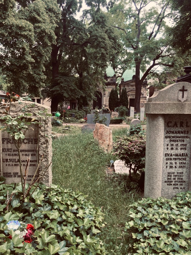 Ich darf ausschlafen, denk ich mir, als ich um 6:30 aufwache. Ich will ausschlafen, also gehe ich kurz ins Bad und dann leg ich mich wieder hin. Einfach, weil ich es kann. Ich schlafe wieder ein, bis mich mein Wecker um 8 Uhr weckt. Es ist so ruhig hier im Hotel oben, das genieße ich im siebten Stock im letzten Zimmer im Gang mit dem Blick auf einen Friedhof. Ich melde mich bei Zimmer 108 und verabrede mich zum Frühstück auf 9 Uhr. Ich dusche erneut und reiße die kleinen Fenster für Frischluft auf. Katharina und ich labern uns durch’s Frühstück und wollen im Anschluss in der Nachbarschaft einen Friedhof gemeinsam erkunden. Klingt komisch, ist aber so. Wir mögen Friedhöfe, auch gern so alte. Dieser hat maximal 130 Jahre alte Gräber und wir wandern teils über Gras, weil es gar keine richtigen Wege oder Pfade gibt. Es regnet, Glocken läuten und wir reden. Über Persönliches und Banales. Wir entdecken Schätze und schon vergessene Namen, erfinden Familiengeschichten je nach Grabanlage und überdenken das „Was bleibt in zwei Generationen noch von mir übrig“ … nicht in einem ängstlichen deprimierten O-Ton, interessiert und realistisch. Wir lachen auch und genießen die Zeit, bleiben aber respektvoll distanziert, wenn wir Trauernde entdecken. Wir sind keine Unmenschen und auch keine Maschinen, weshalb wir uns nach unserem Ausflug noch eine Stunde lang machen, wie ich zu sagen pflege. Noch mal aus allen Klamotten herausschlüpfen und chillen, bevor der Event stattfindet. Vor über einem halben Jahr habe ich Flug und Hotel gebucht.
