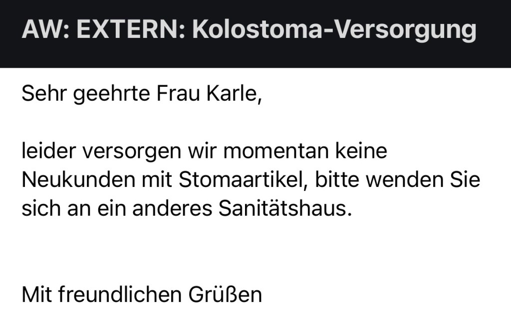Im letzten Monat etwa schrieb ich, wie seit fast 10 Jahren gewohnt, eine WhatsApp-Nachricht an das Care Team meines Sanitätshaus in der Stadt. Sogar etwas spät, Anfang des Monats für die Stoma-Versorgung desselbigen Monats. Es sollte meine letzte Bestellung werden.