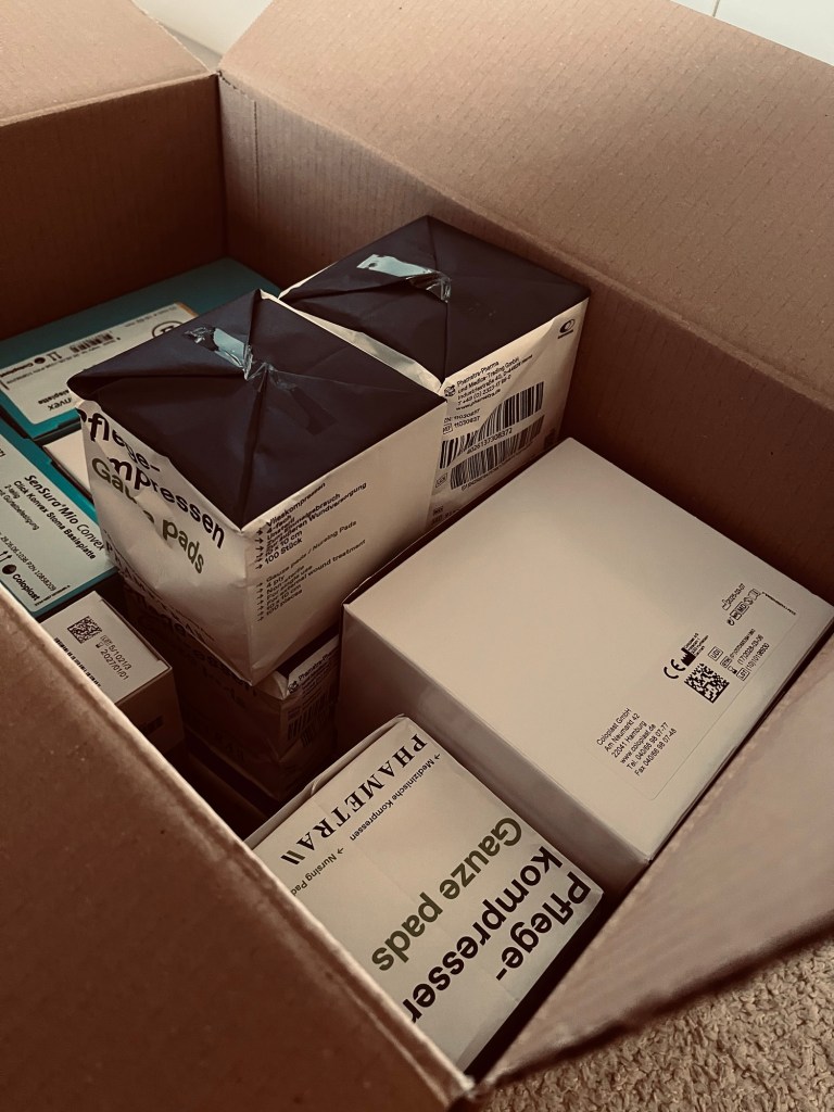 Bereits am Abend konnte ich in der App sehen, dass die Bestellung angelegt worden war und wie damals im Gespräch vereinbart, bekam ich eine Mail mit der Express-Sendungsverfolgung. Ich war beeindruckt. Am nächsten Morgen kam noch der Anruf der Außendienstlerin, dass die Rezepte nicht ganz richtig waren – es wurden zwei Mal Basisplatten abgedruckt statt einmal Basisplatten und einmal Beutel. Die Korrektur würde von Publicare angestoßen. Somit würde das Paket heute einen Karton Notfall-Beutel enthalten, bis es korrigiert separat zugesendet würde. Denn in 4 Tagen würden wir in den Urlaub fahren. Als ich nach Feierabend heim kam, stand da wirklich das Paket!